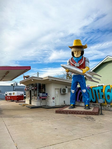 We soaked in the two-step states, stopping at the Outsiders House Museum, wandering the Magnolia Silos in Waco, saying hello to Buck Atom’s Cosmic Curios on 66, and watching longhorn cattle parade through the Fort Worth Stockyards.